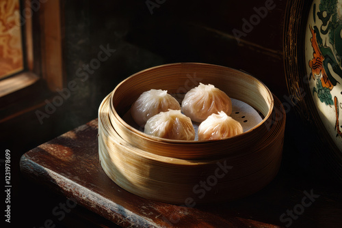 Steamed soup dumplings served in traditional bamboo basket with subtle lighting