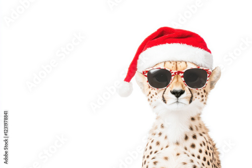 Leopard in Santa hat and sunglasses celebrating festive Christmas holiday