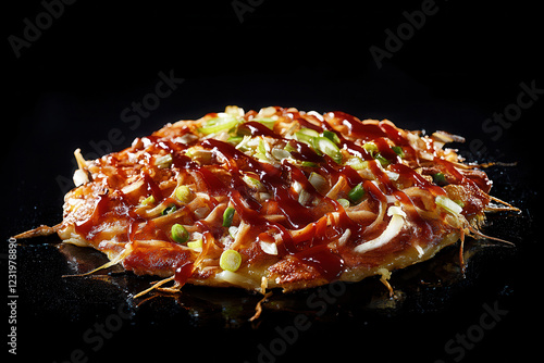 Authentic Japanese okonomiyaki with savory toppings and rich barbecue sauce