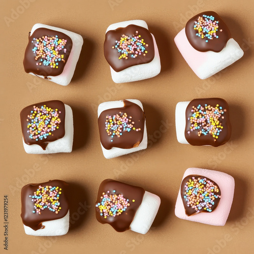 Top view of chocolate-covered marshmallows with colorful sprinkles