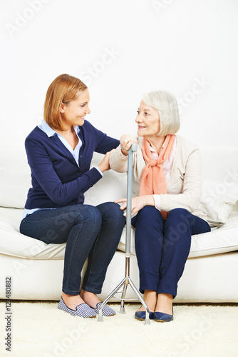 Woman talking to senior woman at home