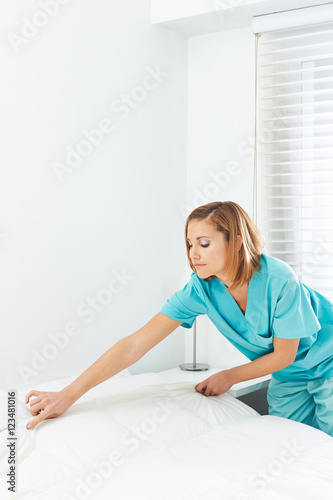 Zimmermädchen macht Bett im Seniorenheim