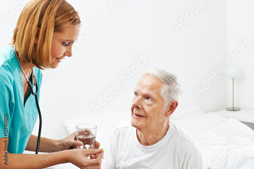 Pflegedienst Frau gibt Seniorin ein Medikament