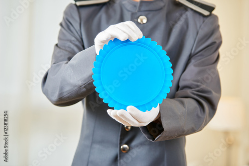 Hand of hotel concierge holding badge