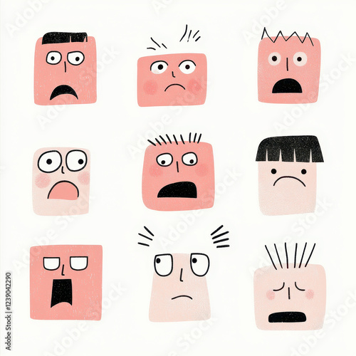 Grid of pink cartoon faces displaying diverse emotional expressions