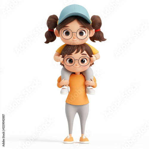 Playful depiction of a child sitting on an adult's shoulders