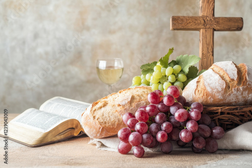 Open Bible with grapes, bread, and wine symbolizing faith and communion