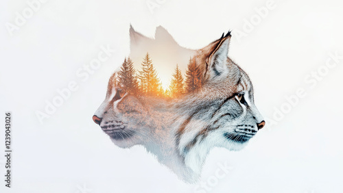 Double exposure of lynx faces blending with forest scenery at sunrise
