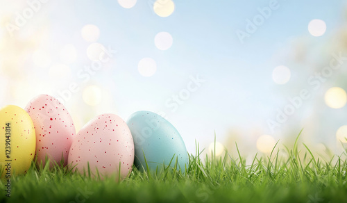 Colorful Easter eggs placed on green grass under soft bokeh lighting
