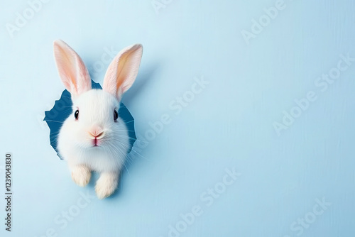 Adorable bunny peeking through a blue paper hole on a soft background.