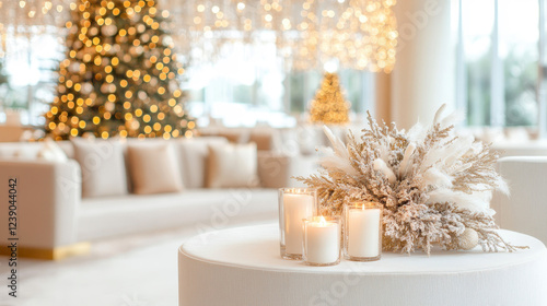 Elegant holiday decor with lit candles and a sparkling Christmas tree