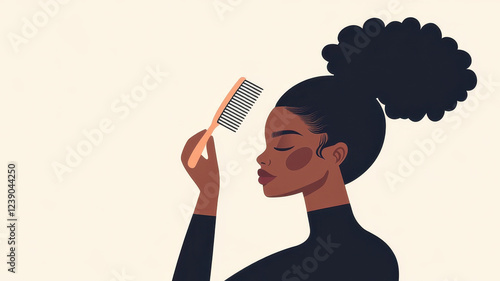 Elegant woman combing her natural hair in a thoughtful pose illustration