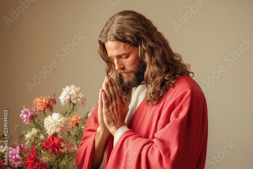 Man in red robe praying surrounded by colorful flowers