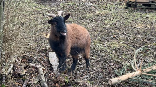 Brown and Black Goat Stands Calmly in a Barnyard Setting, Looking at the Camera, in Slow-Motion