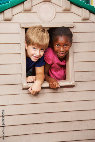 Gruppe Kinder sitzt hintereinander auf Rutsche
