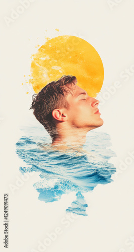 Creative collage combining a serene face, ocean waves, and a bright sun