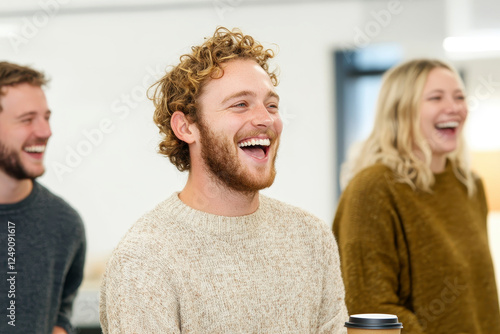 Group of cheerful colleagues sharing laughter in a modern office setting