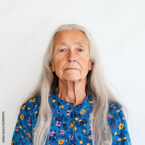 Studio portrait of an elderly Hispanic woman with light skin and simple makeup wearing a floral top, showcasing beauty and wisdom in a serene expression