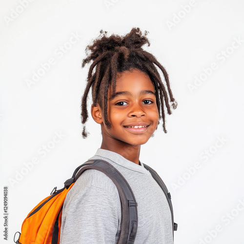 Portrait of a joyful Hispanic boy wearing a bright orange shirt, neutral background