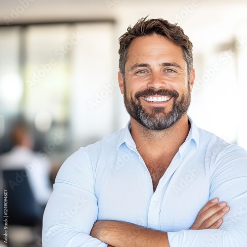 Confident mature Caucasian businessman in his 50s with short gray hair wearing a suit and tie against a neutral background
