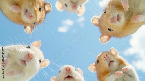 Curious group of bunnies looking downwards in an outdoor sunny setting