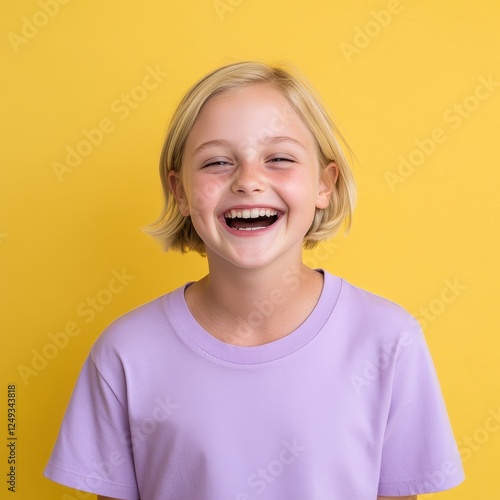 Portrait of a sandy-haired child smiling warmly with joy against a vibrant blue background in casual orange attire.