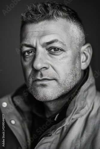Black-and-white portrait of a Lebanese man with a thoughtful expression