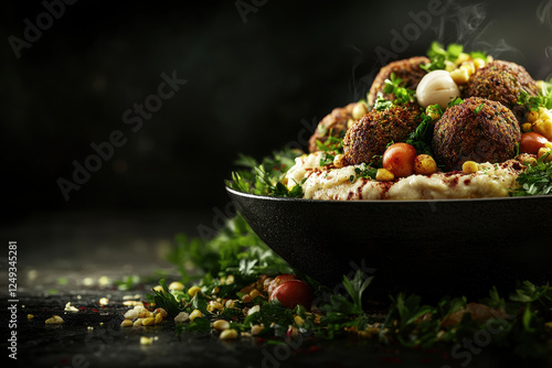 Delicious falafel served over creamy hummus with fresh herbs and side garnishes