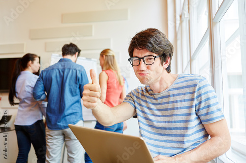 Student am Laptop Computer hält Daumen hoch