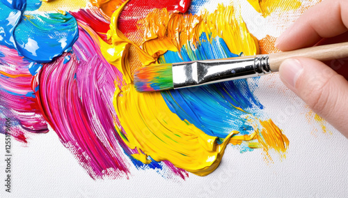 Close-up of colorful paint strokes on canvas with a paintbrush