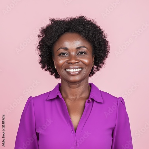 Cheerful Ghanaian woman in her 40s with curly hair smiling brightly