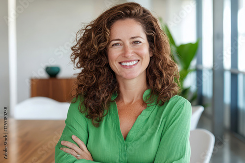 Smiling woman in green blouse standing confidently in bright modern interior