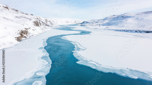 Serene winter landscape with a stream surrounded by snowy plains and blue skies
