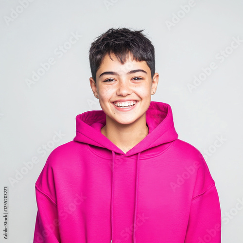 Smiling teen with buzzed hair in vibrant pink hoodie