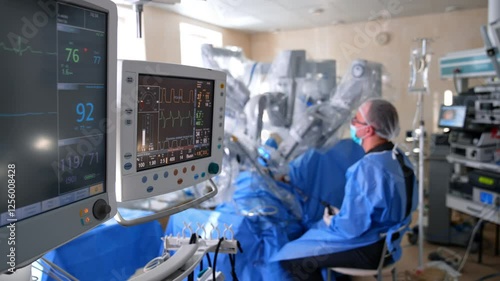 Monitors of artificial lung ventilating machine with life signs of the patient operated by robotic surgeon. Doctor holding a tool device sits at Da Vinci equipment looking at screen. #1256008428