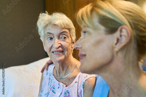 Elderly lady smiling while receiving care and support from a younger woman