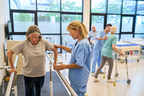 Elderly rehabilitation therapy with caring staff in a supportive facility setting