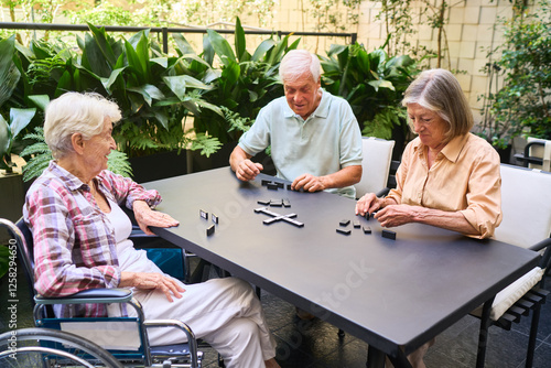 Senior patients and caregiver solving puzzles in rehabilitation facility garden