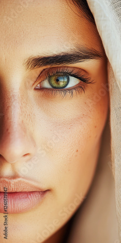 Close-up portrait of a thoughtful Saudi Arabian woman with green eyes