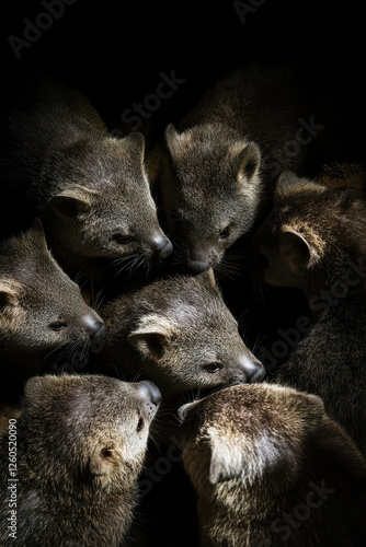 A group of wombats huddled together in a dark and dramatic setting