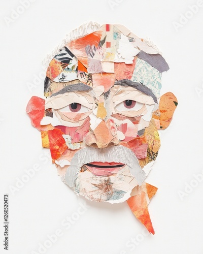 Colorful collage of an elderly man's visage with textured layered paper