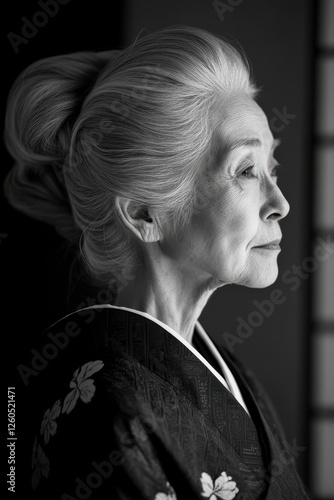 Black and white portrait of an elderly Japanese woman in traditional attire