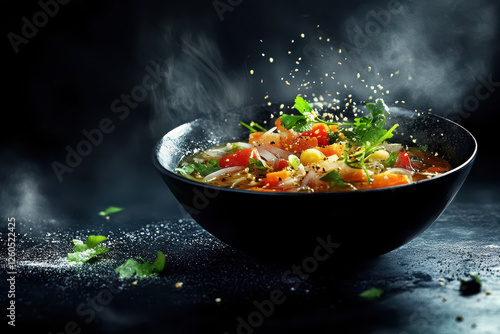 Vibrant vegetarian pho soup in a steaming black bowl with fresh greens