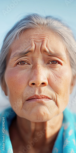 Close-up portrait of a Nepalese senior woman with a thoughtful expression