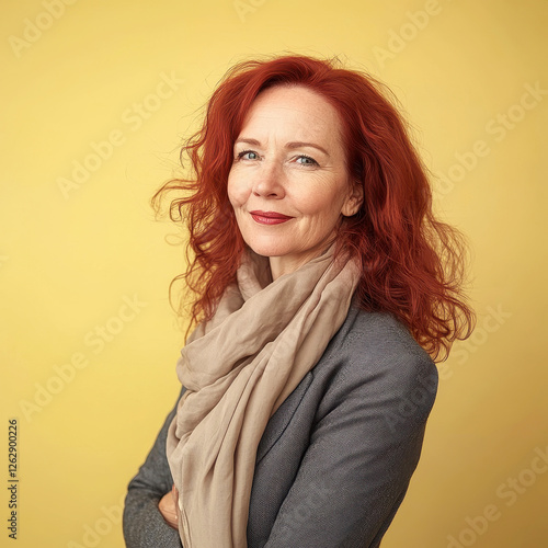 Confident middle-aged woman with red hair and a scarf smiling