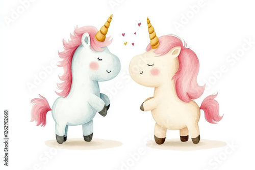 Cute watercolor unicorns with pink manes in a nursery cartoon illustration
