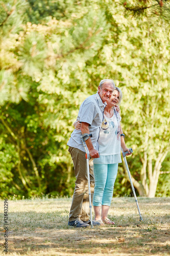 Senioren mit Krücken in der Natur