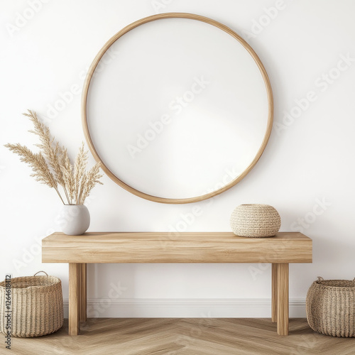 Minimalist wooden bench with natural decor and round mirror in bright interior
