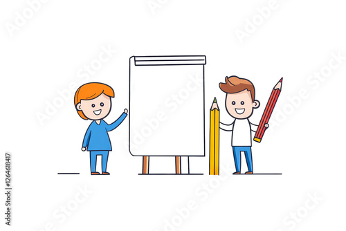 Cartoon depiction of children learning with oversized pencils and abstract shapes