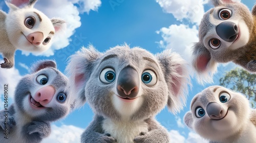 Group of colorful ponies standing in a circle and cheerfully looking down